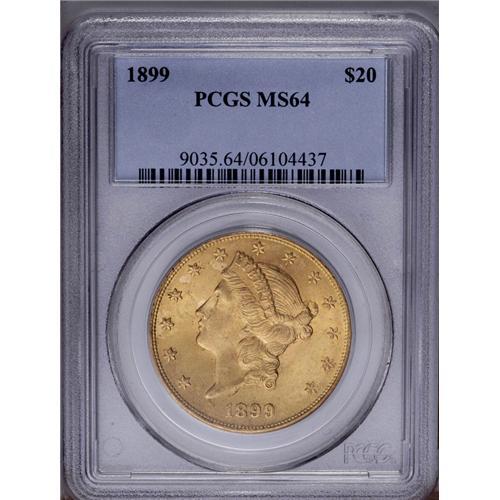 <B>1899<$20> MS64 PCGS.</B></I> Well struck with attractive peach and light orange-gold toning. Minute flyspecks appear on the lower obverse, and superficial blemishes occur in the left obverse field and on Liberty's cheek. PCGS has graded eight examples finer (4/06).