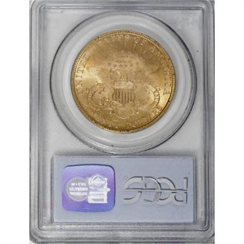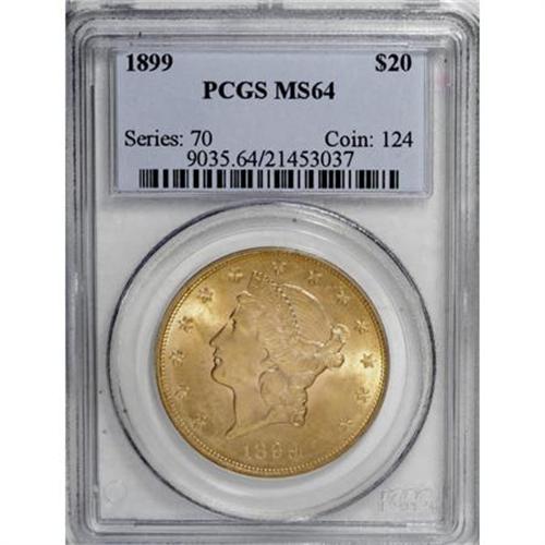 <B>1899 $20 MS64 PCGS.</B></I> Sharply struck with warm luster and attractive peach-gold surfaces. No individually mentionable marks appear on either side, though a number of luster grazes combine to limit the grade. A lovely late 19th century double eagle. PCGS has certified just 10 coins finer (6/07).<BR><BR><B>Coin Engraver:</B> James B. Longacre<BR><BR><b>Shipping:</b> Coins & Currency (<a target="_blank" href="http://www.heritageauctions.com/common/shipping.php">view shipping information</a>\)