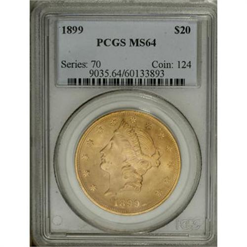 <B>1899 $20 MS64 PCGS.</B></I> PCGS Population (309/10). NGC Census: (812/69). Mintage: 1,669,384. Numismedia Wsl. Price for NGC/PCGS coin in MS64: $1,550. (#9035)<BR><BR><B>Coin Engraver:</B> James B. Longacre<BR><BR><b>Shipping:</b> Coins & Currency (<a target="_blank" href="http://www.heritageauctions.com/common/shipping.php">view shipping information</a>)
