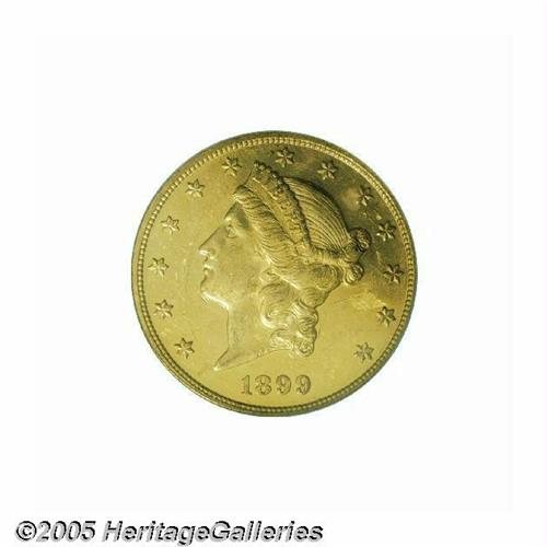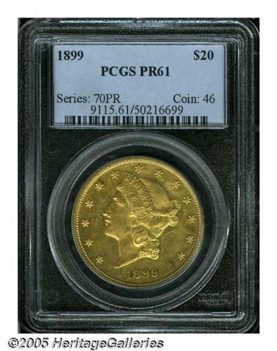 <B>1899<$20> PR61 PCGS.</B></I> An undeniably rare proof striking from an original production of just 84 coins. This specimen has been rather obviously mishandled, perhaps being a victim of the Great Depression or inadvertently venturing into European holdings. There are numerous scuffy abrasions on the obverse, most notably under Liberty's chin and to the left of star 12, and the entire coin is draped in milky patina. For those wishing to own a more affordable proof Double Eagle, here is a definite opportunity.