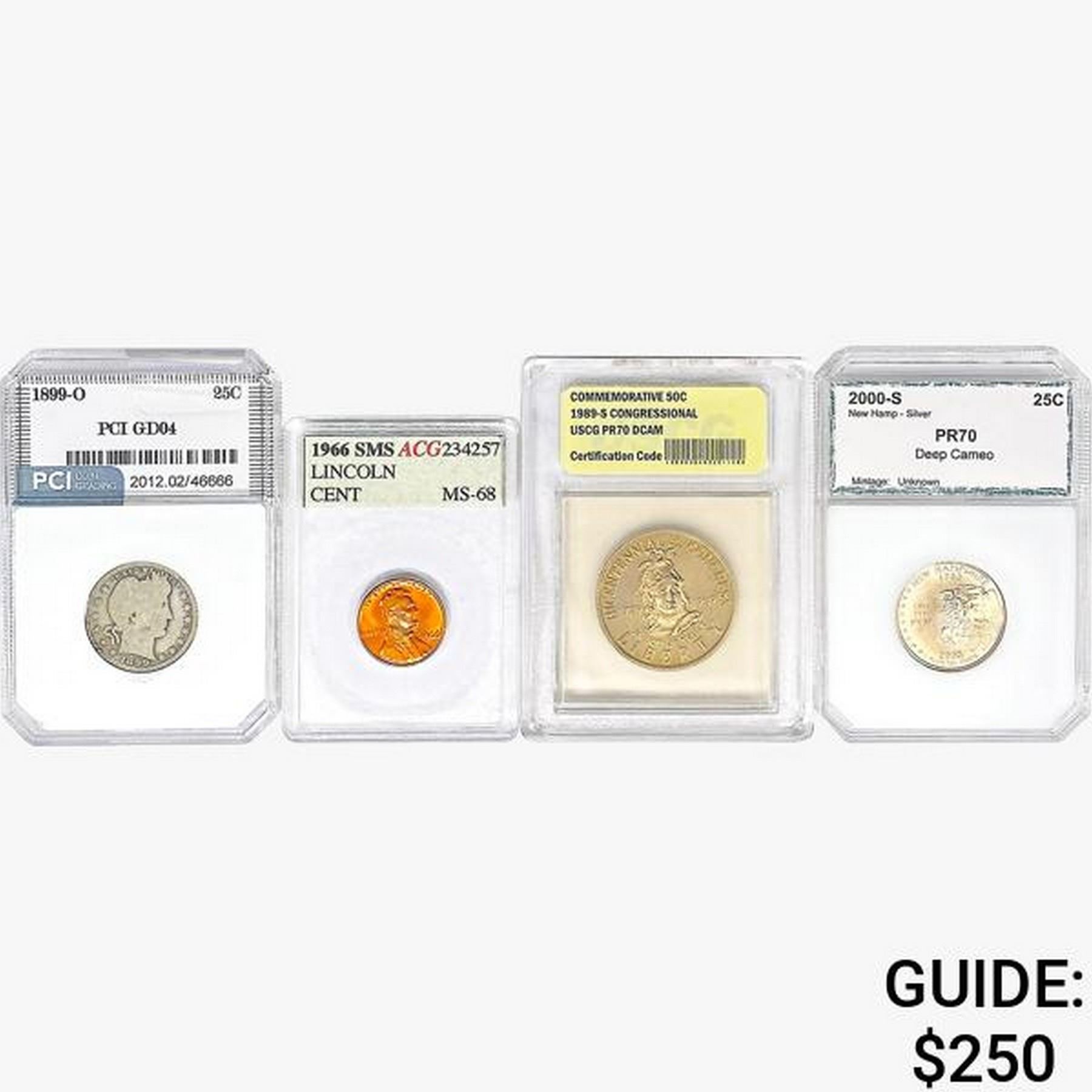 e. Coins sold referencing a third-party grading service are sold “AS IS” without any express or implied warranty, except for a guarantee by GSA that they are genuine. Removal or alteration of the holder, voids all of Bidder’s claims concerning that Product. Certain warranties may be available from the grading services and Bidders are referred to them for further details: Numismatic Guaranty Corporation (NGC), PO Box 4776, Sarasota, FL 34230, www.ngccoin.com/services/writtenguarantee.asp; Professional Coin Grading Services (PCGS), PO Box 9458, Newport Beach, CA 92658, www.pcgs.com/guarantee.html; ANACS, 6555 S. Kenton St., Ste. 303, Englewood, CO 80111; and Independent Coin Grading Co. (ICG), 7901 East Bellview, Ave., Suite 50, Englewood, CO 80111.