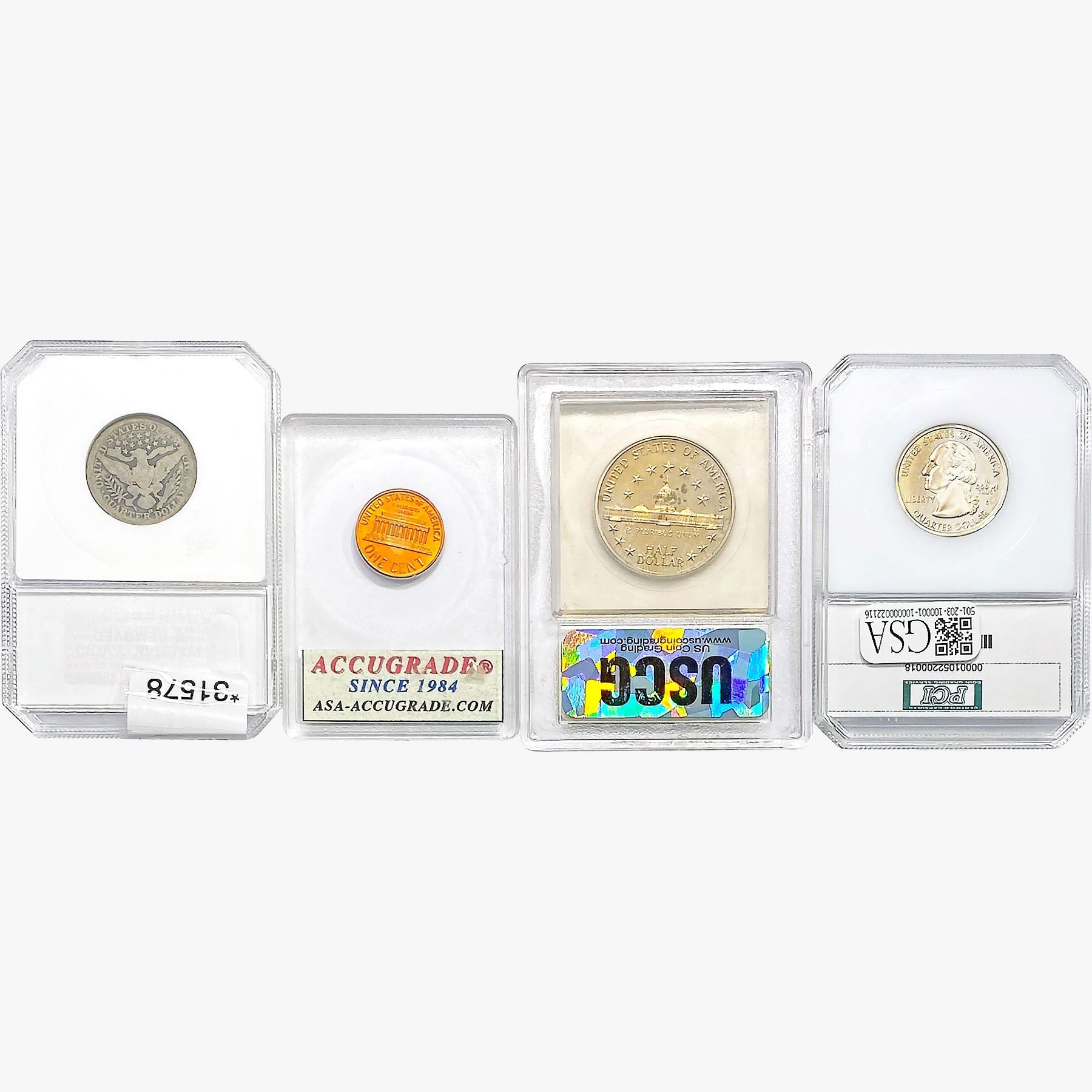 COINS AND CURRENCY LISTED IN GSA’S CATALOG AS GRADED AND ENCAPSULATED BY PCGS, NGC, ANACS, ICG, PCGS CURRENCY, PMG, PCGS BANKNOTE GRADING, CMC OR ANY OTHER THIRD-PARTY GRADING SERVICE ARE LIKEWISE SOLD “AS-IS” EXCEPT AS EXPRESSLY SET FORTH HEREIN. ALL THIRD-PARTY GRADING SERVICE GUARANTEES, INCLUDING AUTHENTICITY, ARE THE SOLE RESPONSIBILITY OF THE THIRD-PARTY GRADING SERVICE AND NOT WARRANTIES OR GUARANTEES OF GSA. BIDDERS SHOULD CONTACT THESE THIRD-PARTY GRADING SERVICES DIRECTLY WITH RESPECT TO ANY CLAIMS OR QUESTIONS THEY MAY HAVE CONCERNING THEIR GUARANTEES AND WARRANTIES. BIDDERS ACKNOWLEDGE AND AGREE THAT AUCTIONEER IS NOT BOUND BY OR LIABLE FOR ANY OPINION OR CERTIFICATION BY ANY THIRD-PARTY GRADING SERVICE. REMOVAL OF A PRODUCT FROM ITS PROTECTIVE CASING OR HOLDER OR ALTERATION OF ANY COIN HOLDER WAIVES ALL RIGHTS CONCERNING THE PRODUCT CONTAINED THEREIN.