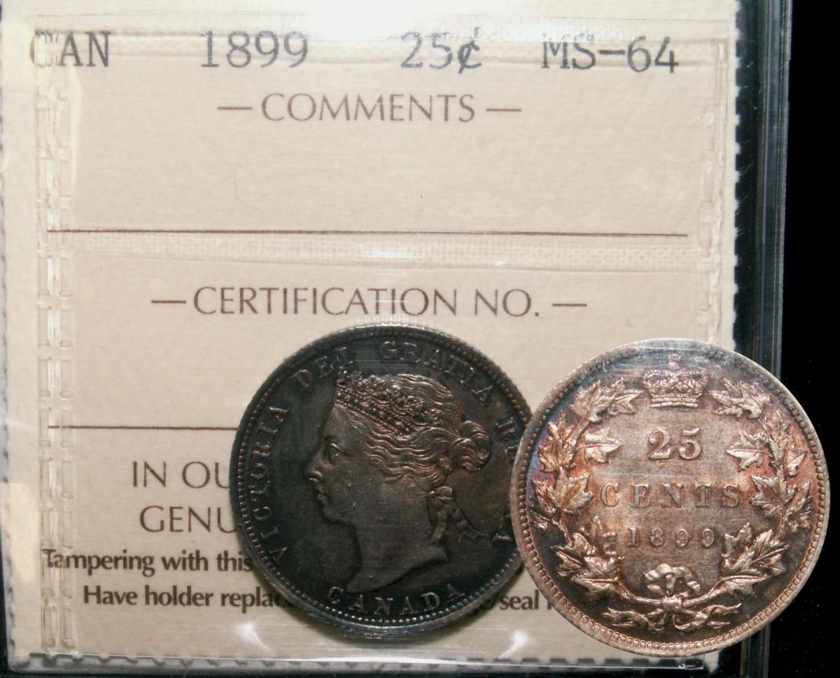 1899 25¢ ICCS MS64. An superb example with intense tone on obverse and fully lustrous.