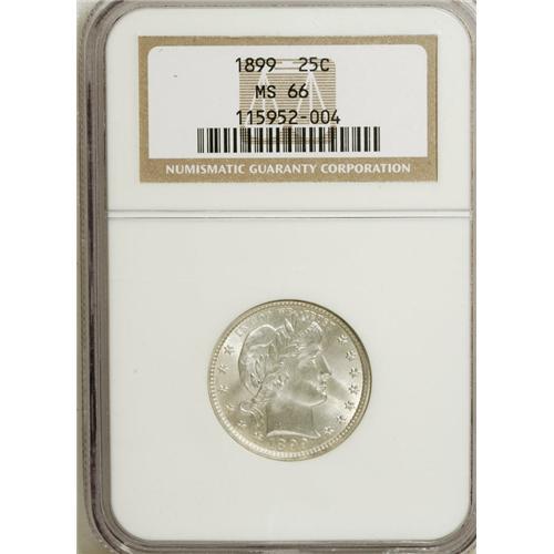 <B>1899 25C MS66 NGC.</B></I> A surprising and attractive Premium Gem representative of this highest-mintage Barber quarter issue, the logical choice for 19th century type collectors. This frosty silver-blue example has just a touch of sage color at the lower obverse and reverse. Well-defined and a condition rarity at this lofty level. Census: 7 in 66, 1 finer (4/07).<BR><BR><b>Shipping:</b> Coins & Currency (<a target="_blank" href="http://www.heritageauctions.com/common/shipping.php">view shipping information</a>)