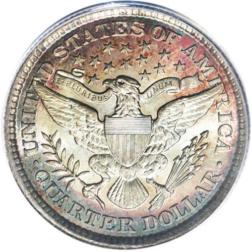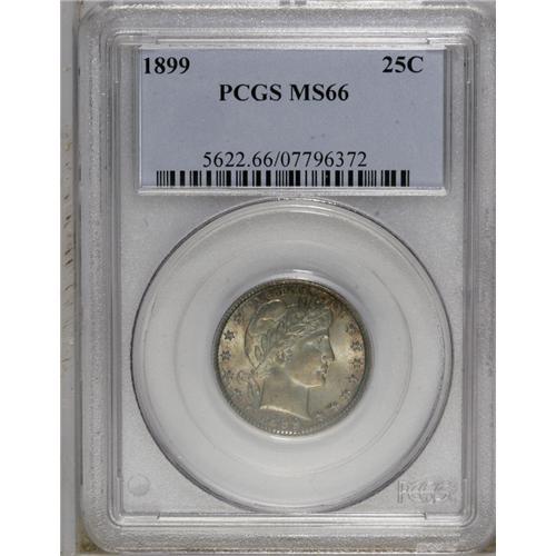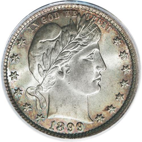 <B>1899<25C> MS66 PCGS.</B></I> Here is a particularly attractive coin that retains strong luster and pleasing, variegated toning over the entire obverse and reverse. Lime-green, violet, gold, and magenta are some of the more prominent colors on display. Sharply struck and near-pristine, this is an outstanding Premium Gem with unsurpassable eye appeal. Population: 11 in 66, 1 finer (8/06).
