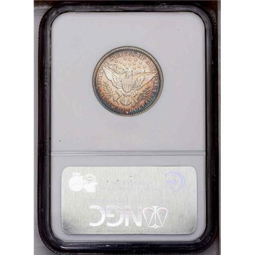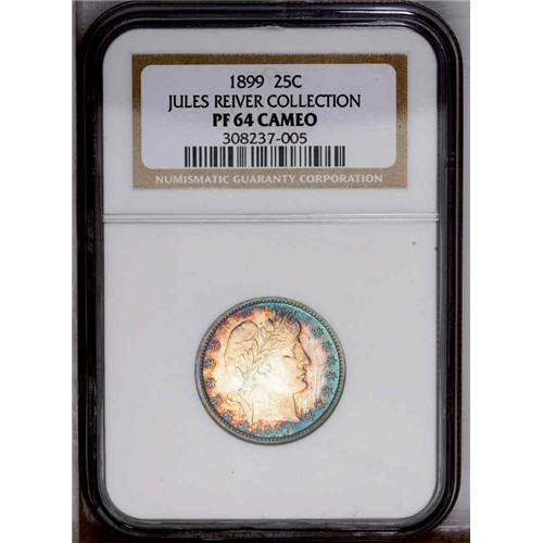 <B>1899<25C> PR64 Cameo NGC.</B></I> This piece is one of only 846 pieces issued in Proof. It exhibits full frost bloom on all of the devices with deep mirror fields. Whispers of cobalt-blue, gold-brown, and lavender toning are confined mostly to the margins. Sharply struck design elements enhance the overall eye appeal of this Near Gem. Some wispy handling marks are noted on Liberty's cheek and neck.