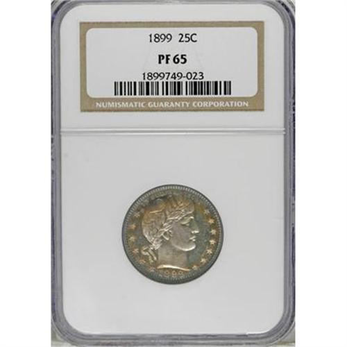 <B>1899 25C PR65 NGC.</B></I> The beautifully frosted devices and fathomless fields combine for magnificent contrast on the reverse, and the obverse offers a measure of contrast as well. Blue-green, violet, and gold shadings enliven the obverse margins, while the reverse shows only faint hints of toning. A marvelous Gem. Census: 27 in 65, 45 finer (11/07).<BR><BR><B>Coin Engraver:</B> Charles E. Barber<BR><BR><b>Shipping:</b> Coins & Currency (<a target="_blank" href="http://www.heritageauctions.com/common/shipping.php">view shipping information</a>)