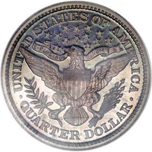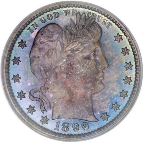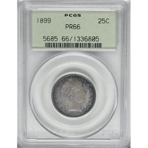 <B>1899 25C PR66 PCGS.</B></I> One of the more frequently encountered dates among proof Barber quarters, with a mintage of 846 pieces. This is a deeply mirrored example that has a dusky gray center on the obverse that is surrounded by deep blue at the margin; while the reverse shows a mixture of blue-green and rose. The reverse is more deeply mirrored than the obverse.<BR><I>From The Chandler Collection.</B></I><BR><BR><B>Coin Engraver:</B> Charles E. Barber<BR><BR><b>Shipping:</b> Coins & Currency (<a target="_blank" href="http://www.heritageauctions.com/common/shipping.php">view shipping information</a>)