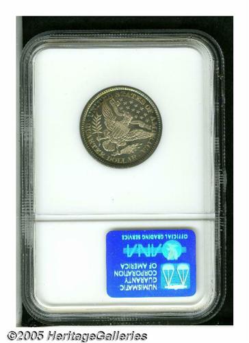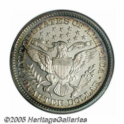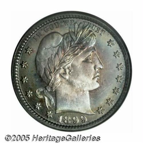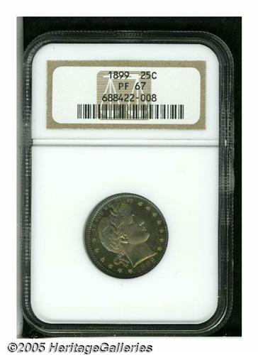 <B>1899<25C> PR67 NGC.</B></I> The obverse of this Superb specimen features swirling aqua and rose-gray toning that lightens just a bit at the center of the portrait. Milky golden patina blankets the well mirrored reverse. Population: 19 in 67, 6 finer (5/05).