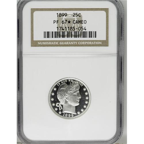 <B>1899 25C PR67 <img border='0' src='http://www.heritagecoins.com/images/star.gif' width=10 height=10> Cameo NGC.</B></I> The startling white-on-black contrast seen on both sides of this Superb Gem specimen is reminiscent of some modern, post-1950 proofs. Silver-white devices are beautifully frosted and sharply struck. The jet-black fields display unfathomable depths of mirrored reflectivity. An essentially pristine survivor from the final year of the 19th century. Of the eight pieces graded at MS67 Cameo, by NGC, this is the only one to achieve the coveted "Star" designation, denoting exceptional eye appeal. Census: 8 in 67 Cameo, 4 finer (11/06).<BR><I>From The James Paul Collection.</B></I><BR><BR><b>Shipping:</b> Coin/Currency (<a target="_blank" href="http://www.heritageauctions.com/common/shipping.php">view shipping information</a>)