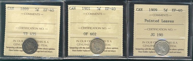 1899 5¢, 1901 & 1909 Ptd Lvs ICCS EF40. Lot of 3 coins.