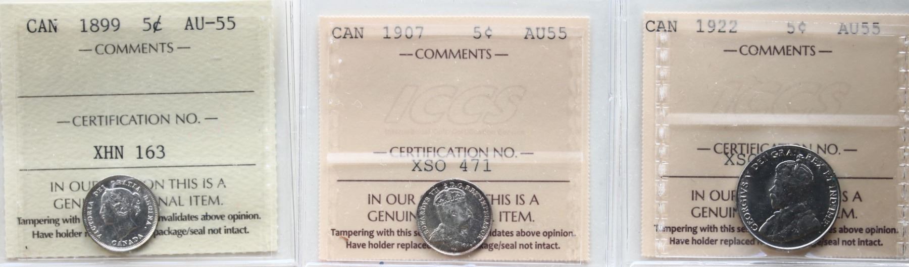 1899 5¢, 1907, 1922. Lots of 3 coins all ICCS Choice About Uncirculated-55