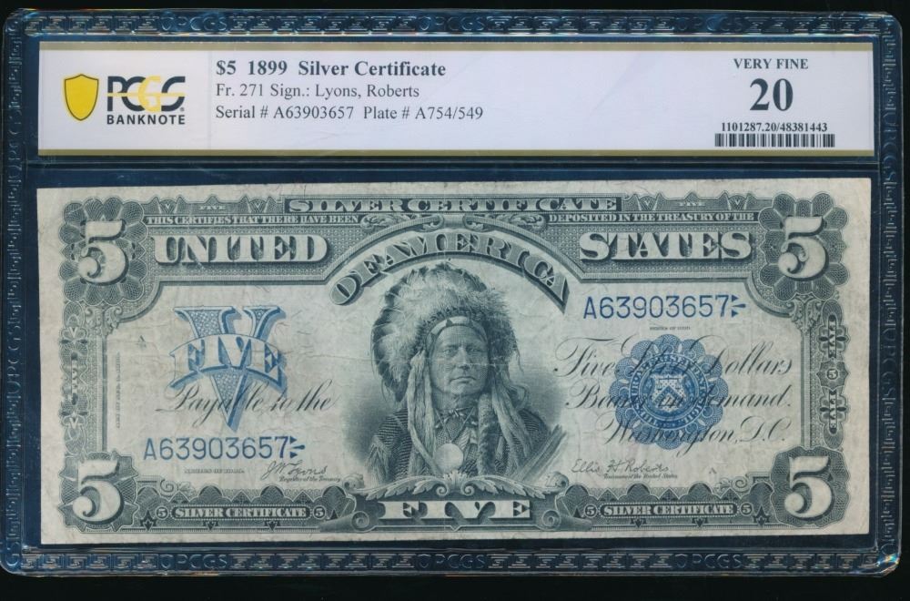 One 1899 $5 Chief Silver Certificate PCGS 20.