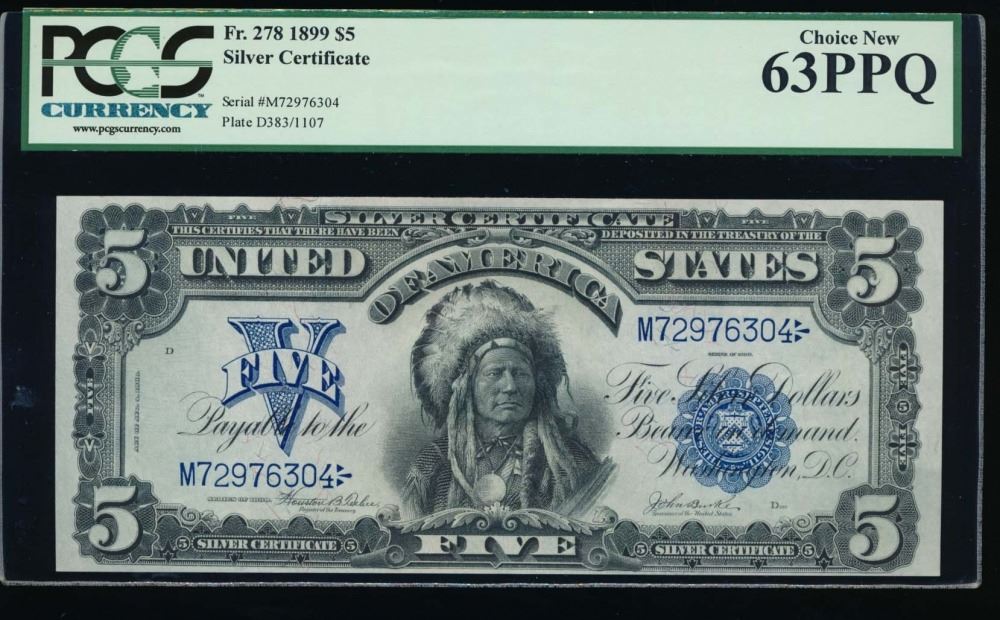 One 1899 $5 Chief Silver Certificate PCGS 63PPQ.