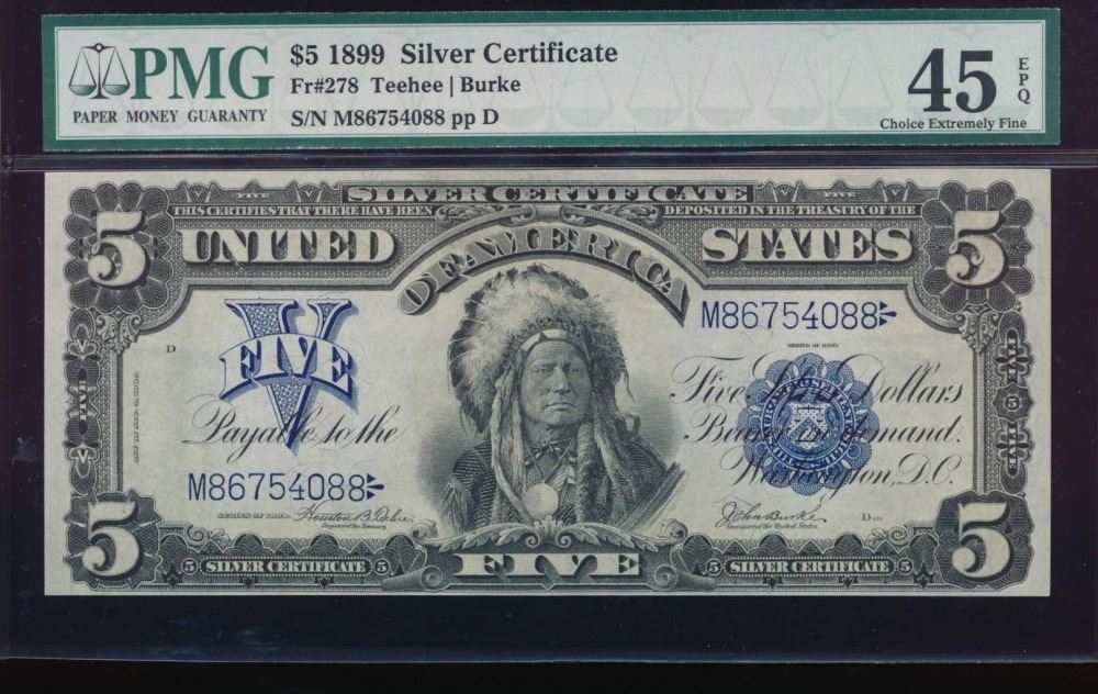 One 1899 $5 Chief Silver Certificate PMG 45EPQ.