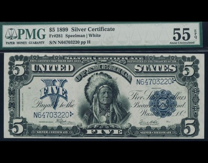 One 1899 $5 Chief Silver Certificate PMG 55EPQ.