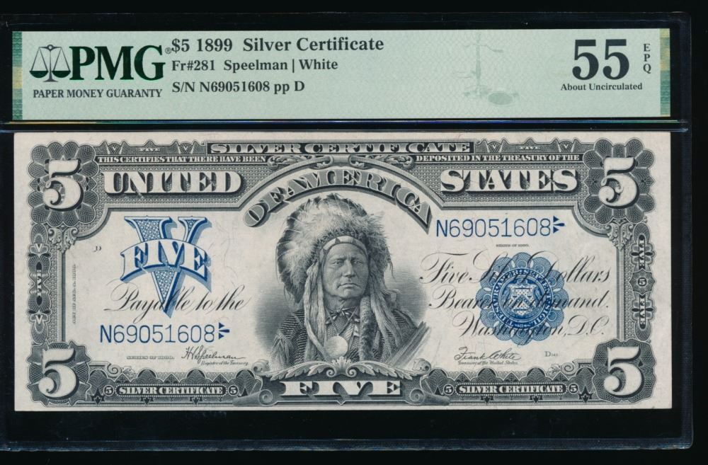 One 1899 $5 Chief Silver Certificate PMG 55EPQ.