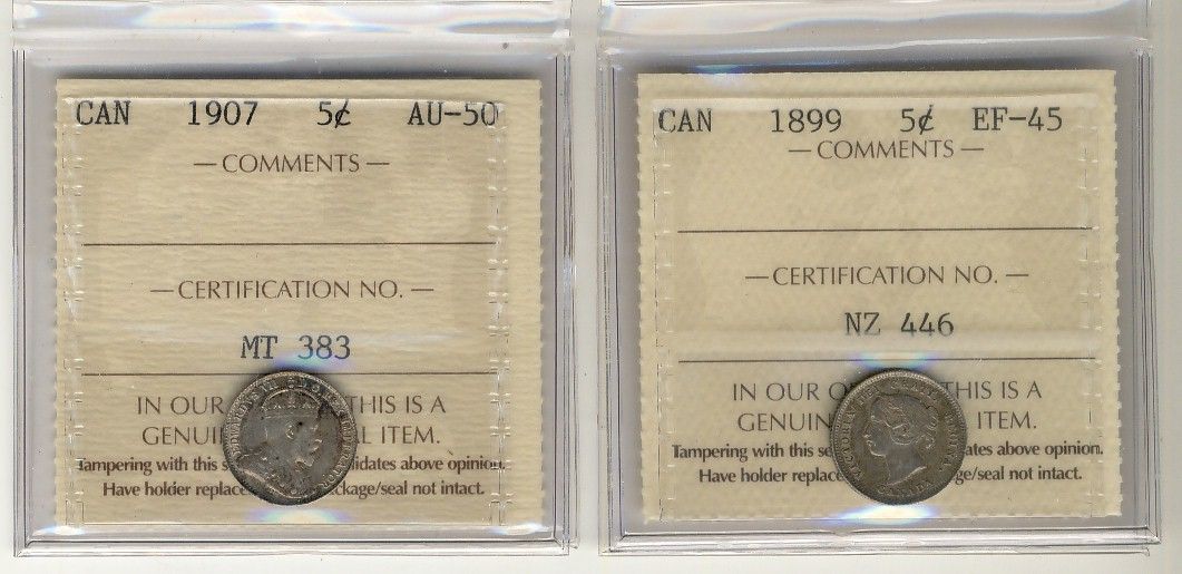 1899 5¢ EF45 & 1907 AU50. Lot of 2 coins both ICCS graded.