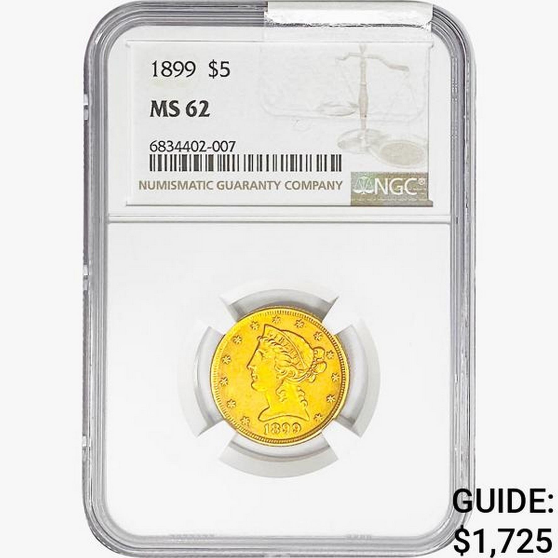 1899 $5 Gold Half Eagle NGC MS62