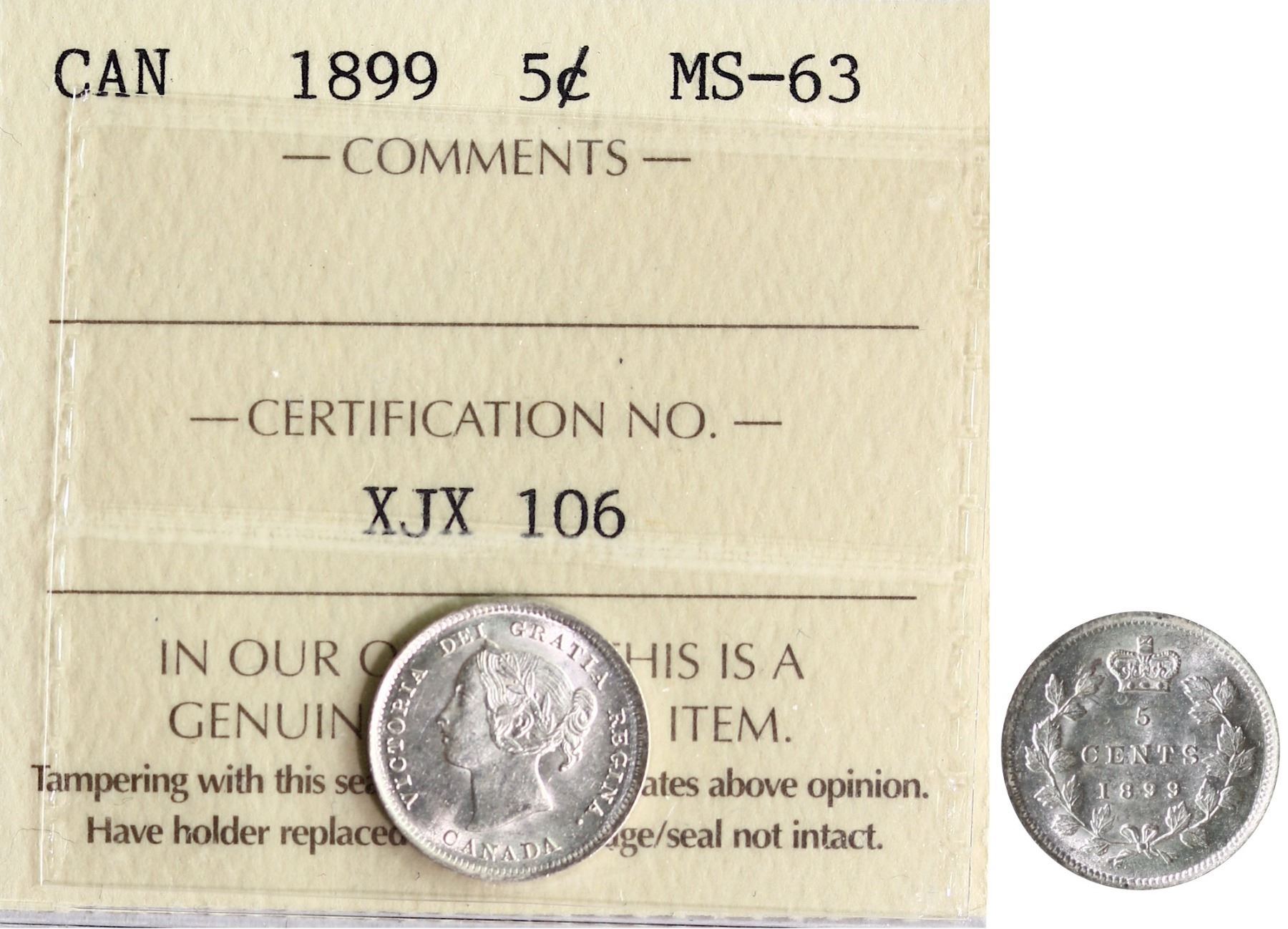 1899 5¢ ICCS Choice Mint State-63, Fully brilliant and lustrous.