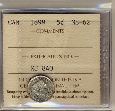1899 5¢ ICCS MS62. A nice lustrous example with light toning.