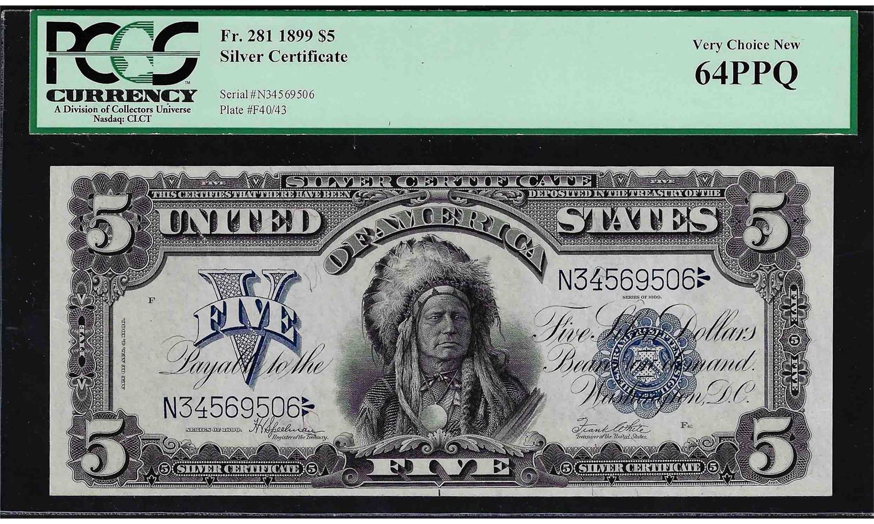 One 1899 $5 Indian Chief Silver Certificate Bank Note PCGS Very Choice New 64PPQ. PCGS Graded.