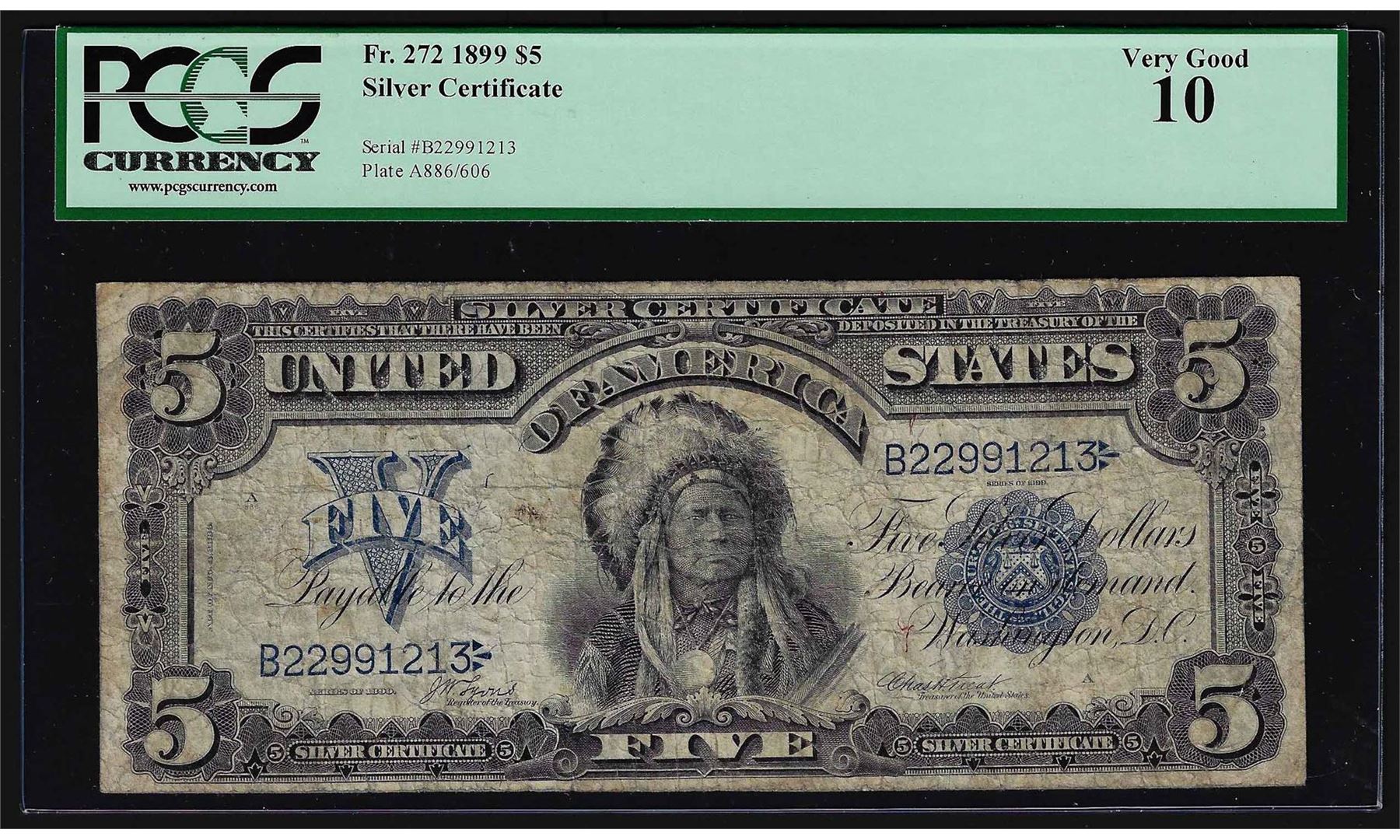 One 1899 $5 Indian Chief Silver Certificate Bank Note PCGS Very Good 10. PCGS Graded.