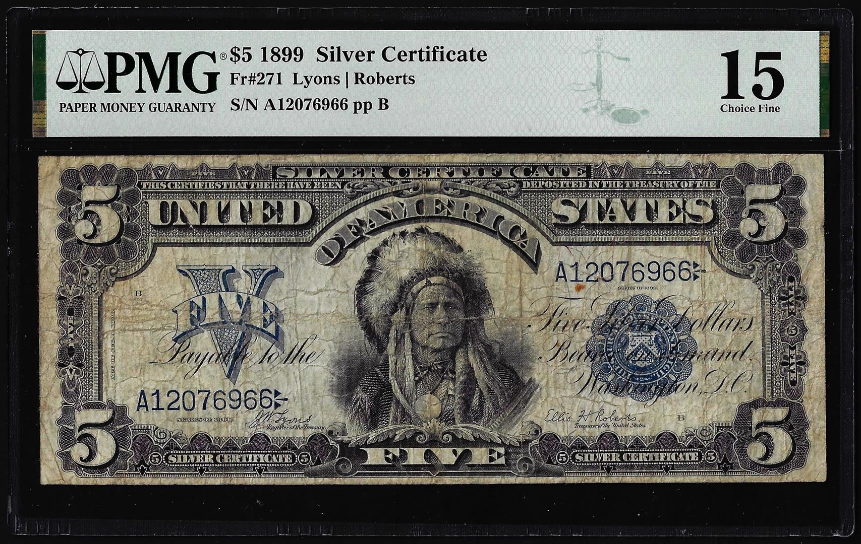 One 1899 $5 Indian Chief Silver Certificate Note Fr.271 PMG Choice Fine 15. PMG Certified.