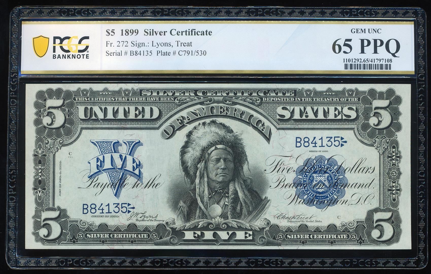 One 1899 $5 Indian Chief Silver Certificate Note Fr.272 PCGS Gem Uncirculated 65PPQ. PCGS Graded.