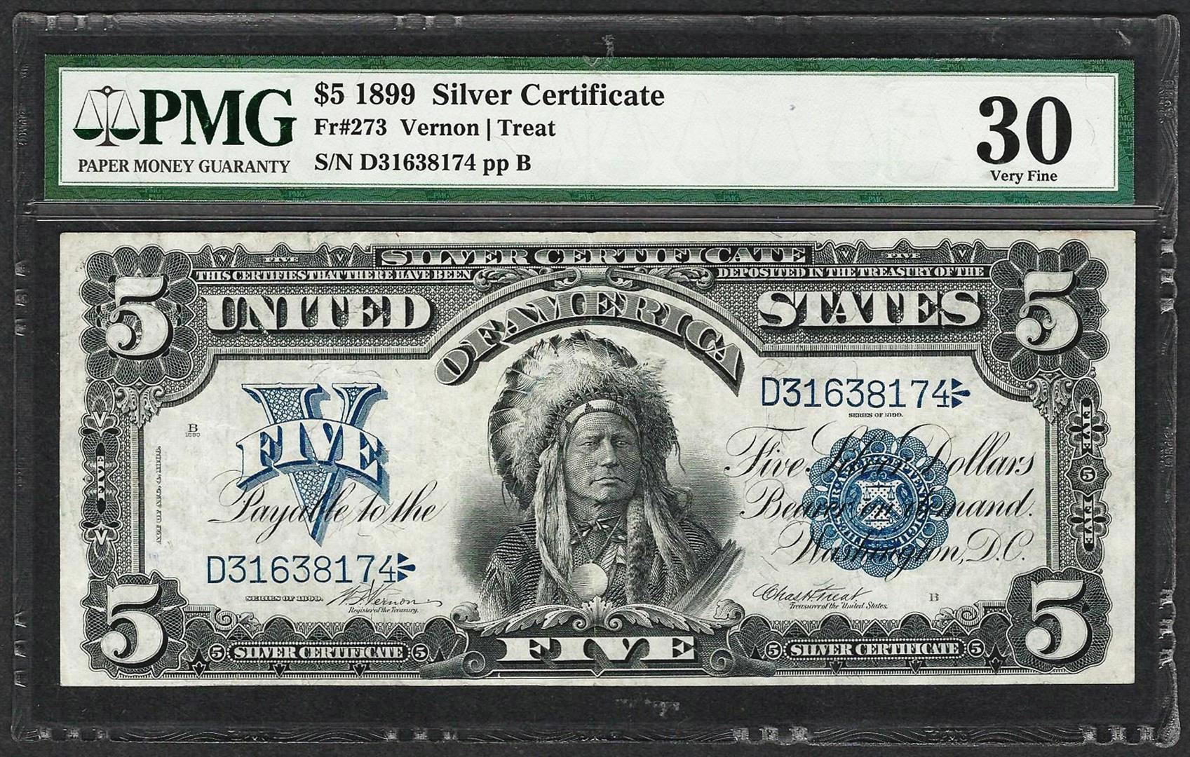 One 1899 $5 Indian Chief Silver Certificate Note Fr.273 PMG Very Fine 30. PMG Certified.