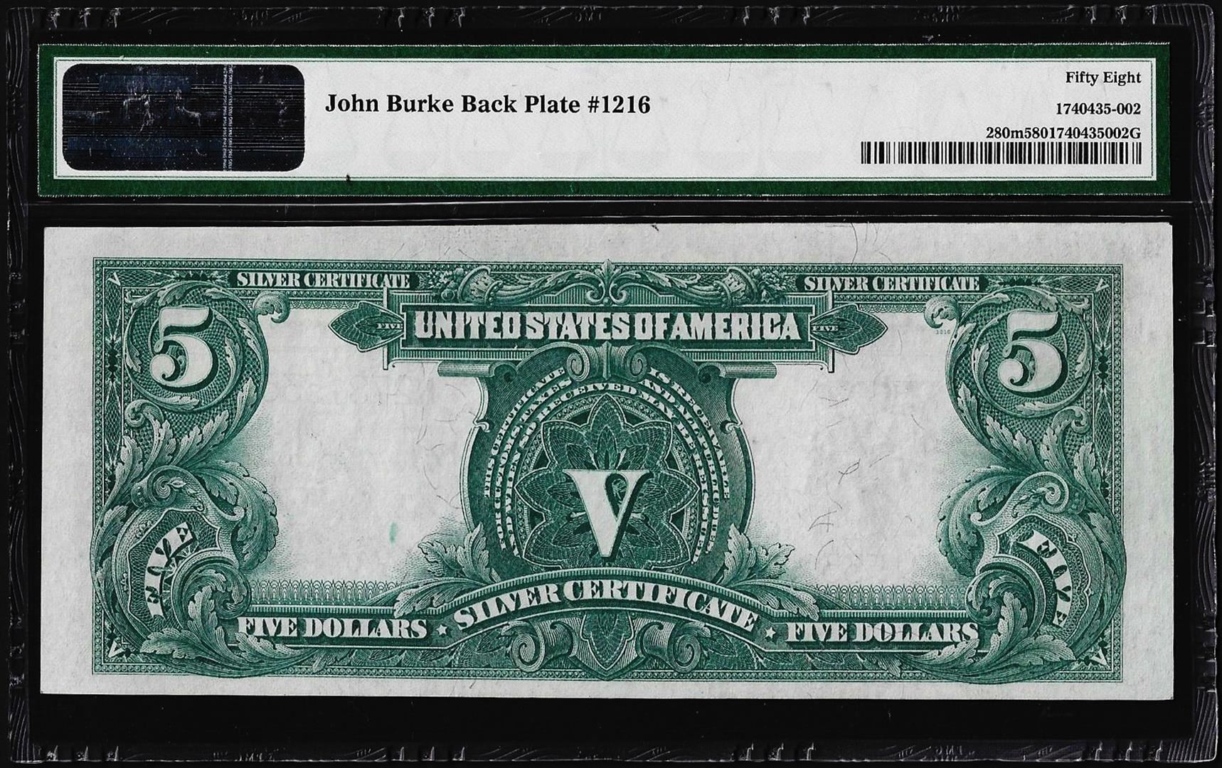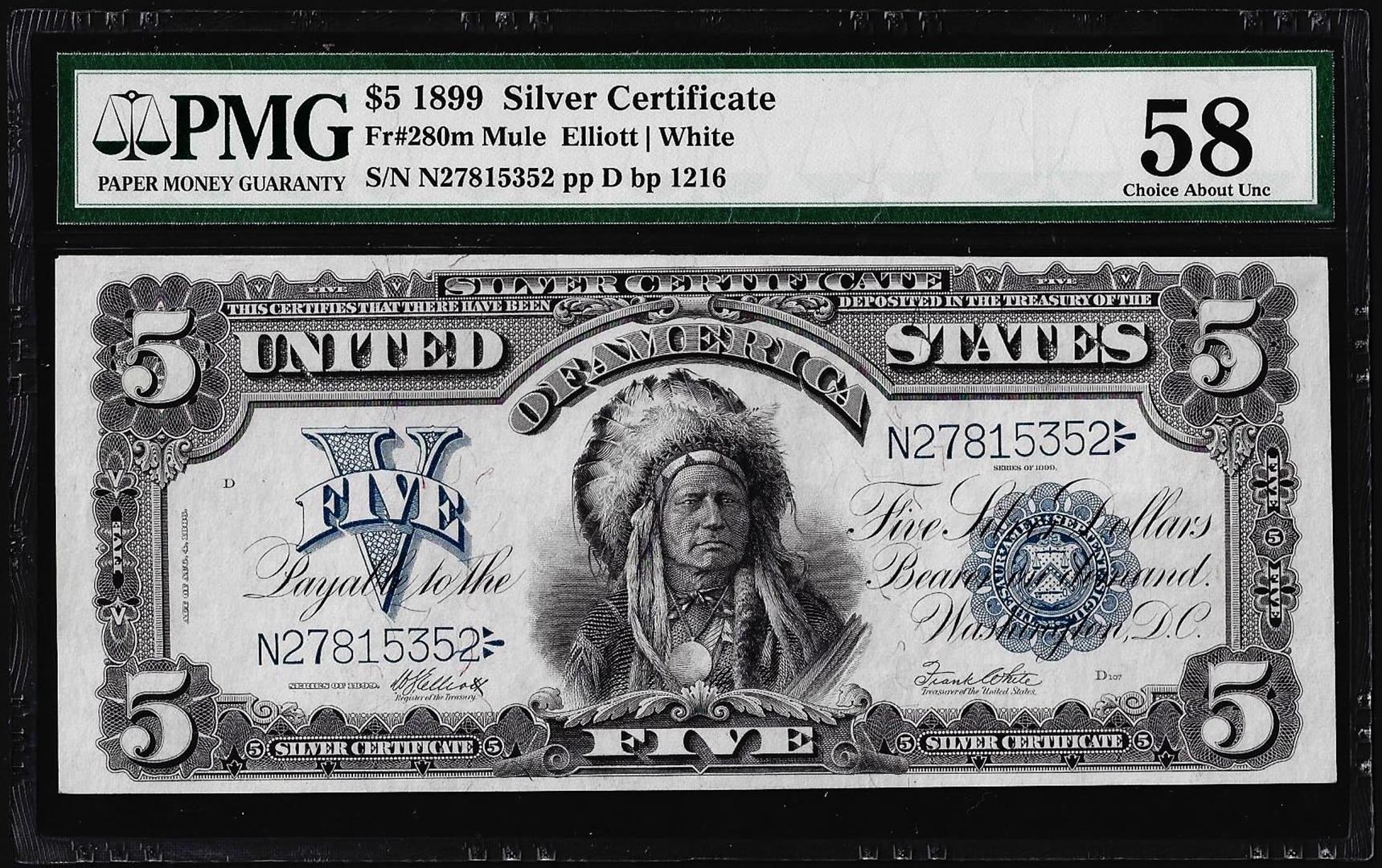 One 1899 $5 Indian Chief Silver Certificate Note Fr.280m PMG Choice About Uncirculated 58. PMG Certified.