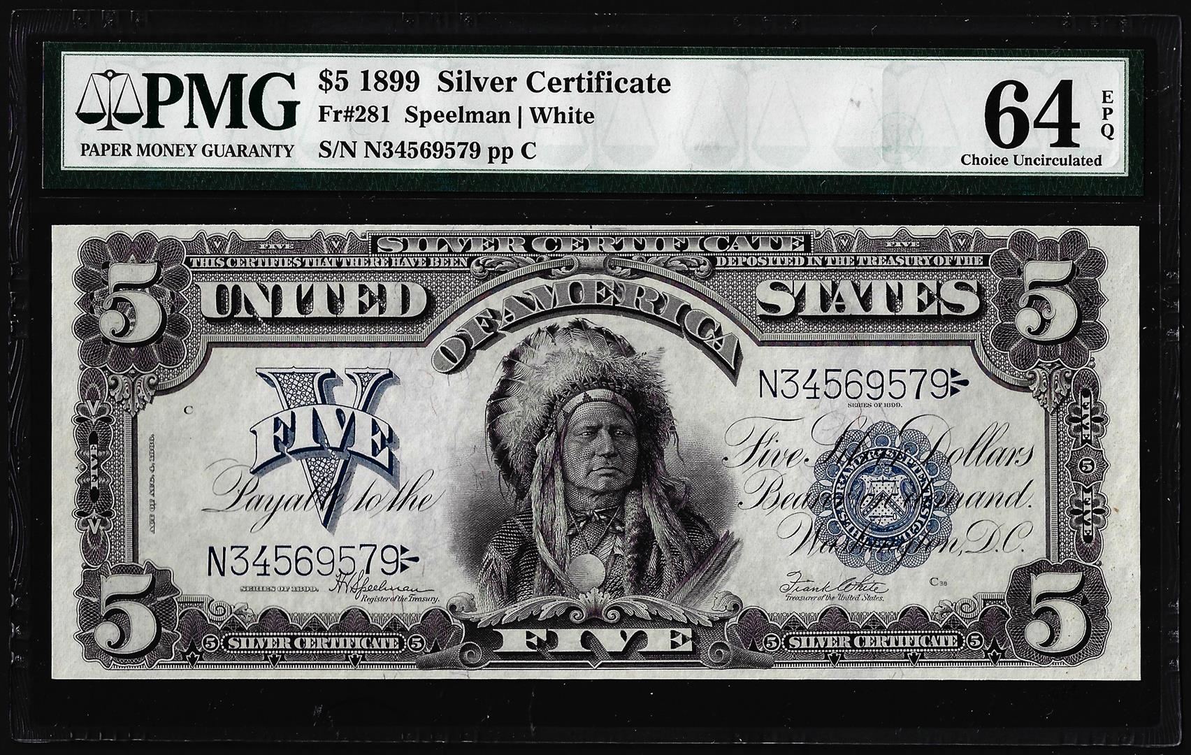 One 1899 $5 Indian Chief Silver Certificate Note Fr. 281 PMG Choice Uncirculated 64EPQ. PMG Certified.