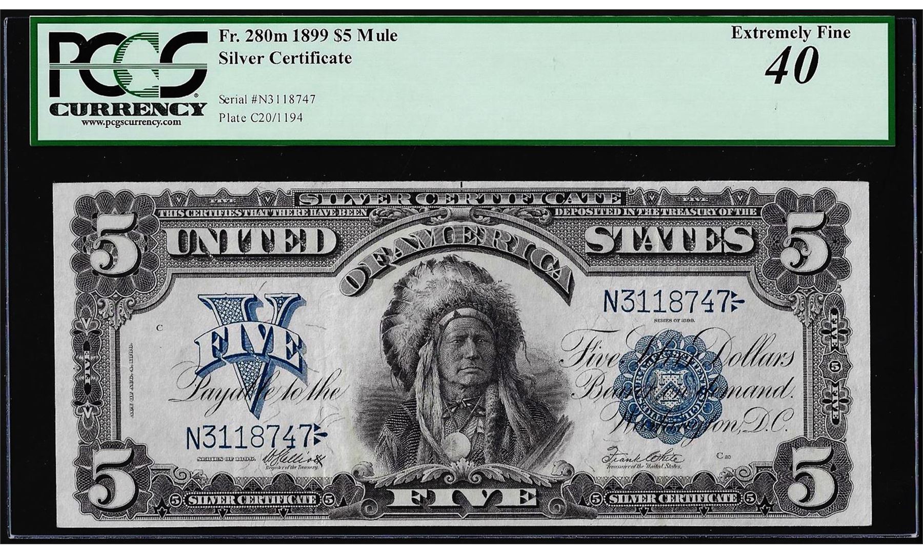 One 1899 $5 Indian Chief Silver Certificate Note Mule Fr.280m PCGS Extremely Fine 40. PCGS Graded.