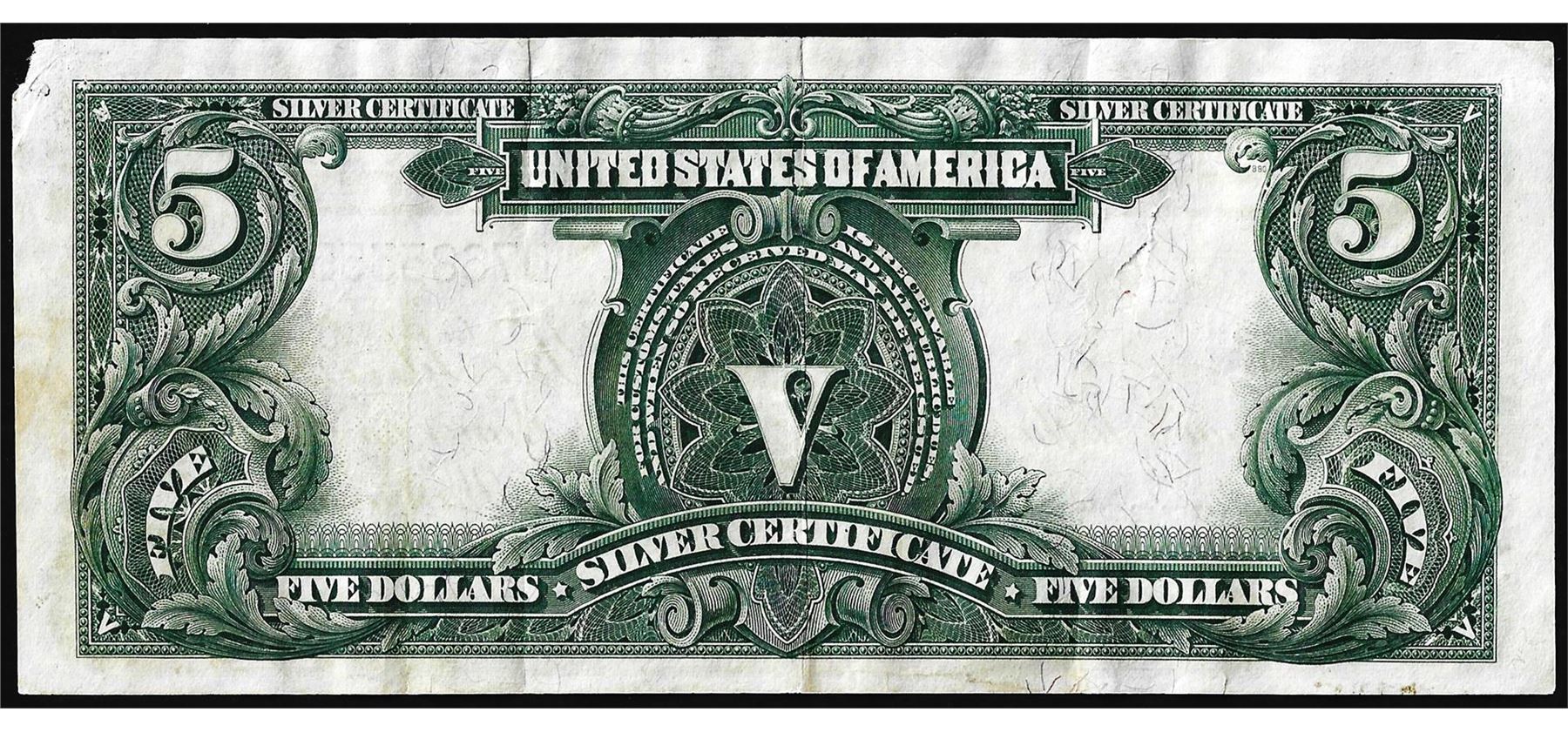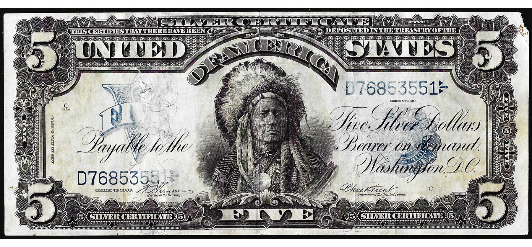 One 1899 $5 Indian Chief Silver Certificate Note, as shown the corner is missing and the seals appear to be faded.