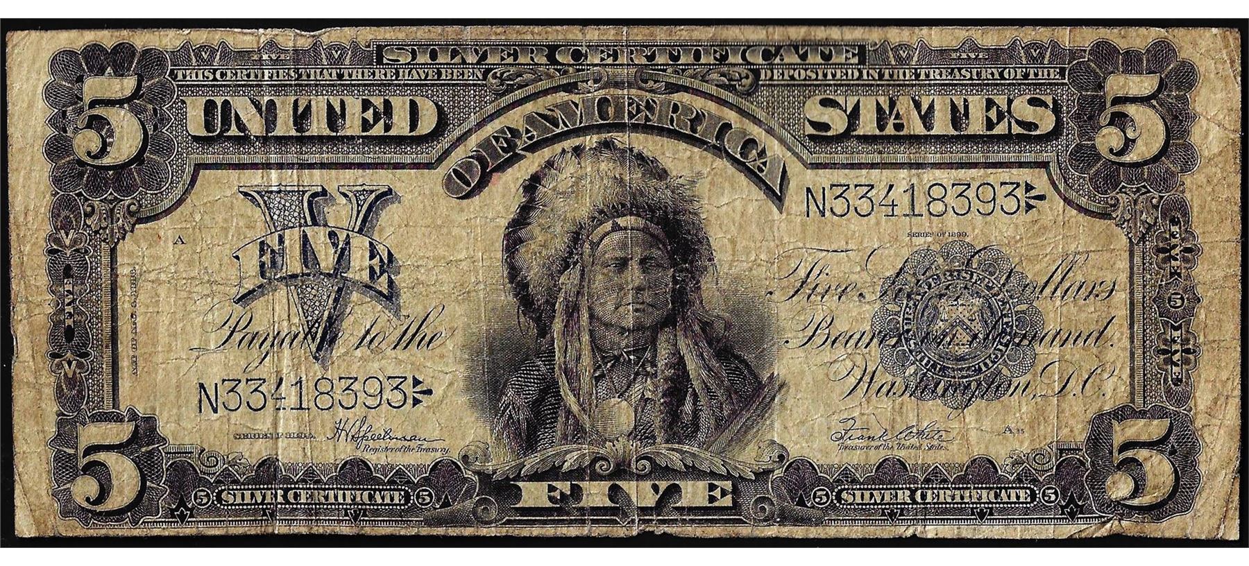 One 1899 $5 Indian Chief Silver Certificate Note.