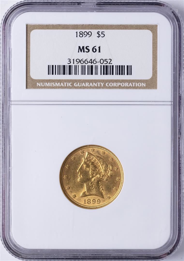 One 1899 $5 Liberty Head Half Eagle Gold Coin NGC MS61. NGC Certified.