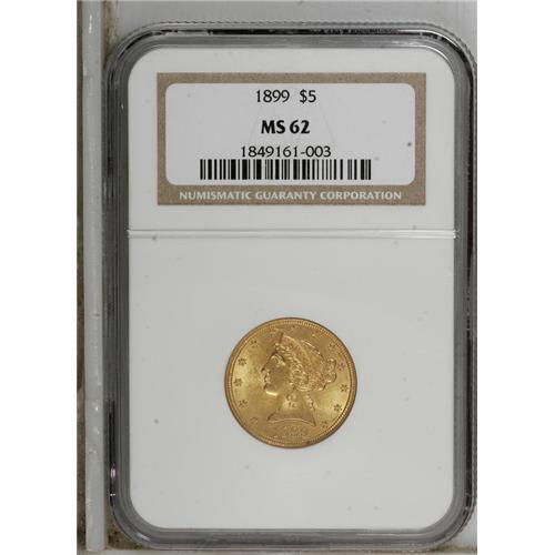 <B>1899 $5 MS62 NGC.</B></I> NGC Census: (2650/4324). PCGS Population (1538/1668). Mintage: 1,710,729. Numismedia Wsl. Price for NGC/PCGS coin in MS62: $260. (#8398)<BR><BR><b>Shipping:</b> Coins & Currency (<a target="_blank" href="http://www.heritageauctions.com/common/shipping.php">view shipping information</a>)