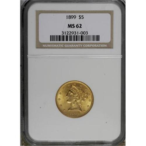<B>1899 $5 MS62 NGC.</B></I> . NGC Census: (2811/4643). PCGS Population (1604/1761). Mintage: 1,710,729. Numismedia Wsl. Price for NGC/PCGS coin in MS62: $325. (#8398)<BR><BR><B>Coin Engraver:</B> Christian Gobrecht<BR><BR><b>Shipping:</b> Coins & Currency (<a target="_blank" href="http://www.heritageauctions.com/common/shipping.php">view shipping information</a>)