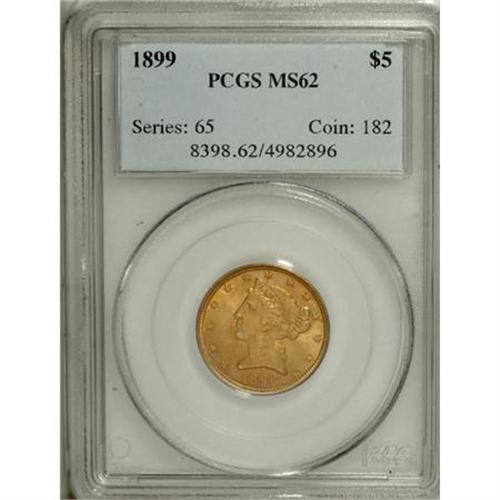 <B>1899 $5 MS62 PCGS.</B></I> PCGS Population (1566/1690). NGC Census: (2691/4456). Mintage: 1,710,729. Numismedia Wsl. Price for NGC/PCGS coin in MS62: $285. (#8398)<BR><BR><B>Coin Engraver:</B> Christian Gobrecht<BR><BR><b>Shipping:</b> Coins & Currency (<a target="_blank" href="http://www.heritageauctions.com/common/shipping.php">view shipping information</a>)