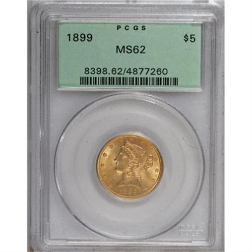 <B>1899 $5 MS62 PCGS.</B></I> PCGS Population (1577/1699). NGC Census: (2691/4456). Mintage: 1,710,729. Numismedia Wsl. Price for NGC/PCGS coin in MS62: $310. (#8398)<BR><BR><B>Coin Engraver:</B> Christian Gobrecht<BR><BR><b>Shipping:</b> Coins & Currency (<a target="_blank" href="http://www.heritageauctions.com/common/shipping.php">view shipping information</a>)