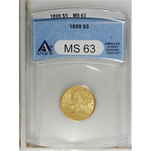 <B>1899 $5 MS63 ANACS.</B></I> NGC Census: (2378/1942). PCGS Population (1134/0). Mintage: 1,710,729. Numismedia Wsl. Price for NGC/PCGS coin in MS63: $920. (#8398)<BR><BR><b>Shipping:</b> Coins & Currency (<a target="_blank" href="http://www.heritageauctions.com/common/shipping.php">view shipping information</a>)