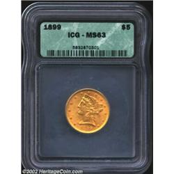 1899 $5 MS63 ICG. A boldly struck and lustrous piece with immaculate fields that at first glance app