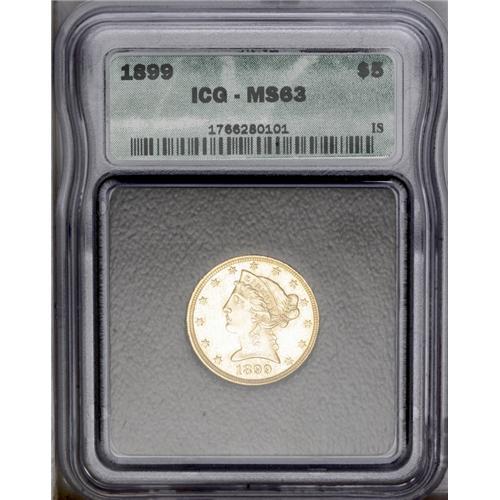 <B>1899<$5> MS63 ICG.</B></I> Semi-prooflike fields and pleasant toning are hallmarks of this Mint State example. Boldly struck except for a few of the left side stars, and showing only a handful of scattered, trivial blemishes.