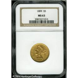 1899 $5 MS63 NGC. Lustrous surfaces reveal peach-g <B>1899 $5 MS63 NGC.</B></I> Lustrous surfaces reveal peach-gold patination, and well struck design elements. Light contact marks on Liberty's neck and cheek preclude a higher grade. <BR><BR><B>Important notice:</B> Heritage usually auctions material at the rate of 200-250 lots per hour. On some occasions eBay Live bid software or the Internet may not be able to keep up with the pace of the auction. We recommend placing a realistic absentee bid now as insurance to avoid disappointment. Occasionally the auctioneer may eliminate or reject an eBay Live bid, and the auctioneer may also reopen a lot after the close of the eBay live bidding (usually because we missed an audience bid), and may reject your bid even if it shows you as the winning bidder. By bidding via eBay Live, you agree that Heritage may award the lot to another bidder at its sole discretion under the circumstances described above or any other reasonable circumstances. Since eBay bids are not shown to us until we open the lot on the floor, we treat those bids just like floor bids. In most cases the floor responds before the eBay bid is presented to us, due to Internet lag time, so for consistency we have made it a policy that floor bids are always considered first over tie eBay live bids. Also please note that all Heritage lots purchased through eBay Live carry a 20% Buyer's Premium. Please make sure you read the Terms and Conditions before you bid. This lot is being auctioned in conjunction with a live floor auction by Heritage Galleries & Auctioneers. All final auction and invoice information will be supplied by Heritage Galleries & Auctioneers, and all other information should be considered preliminary. Lot:6679