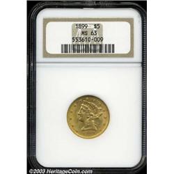 <TABLE cellSpacing=0 cellPadding=0 width="100%" bgColor=#000000 border=0><TBODY><TR><TD width="100%"><TABLE cellSpacing=1 cellPadding=3 width="100%" border=0><TBODY><TR><TD width="100%" bgColor=#79735c><FONT face=arial color=#ffffff size=3><B>Description</B> </FONT></TD></TR><TR><TD width="100%" bgColor=#ffffff><FONT face=arial size=2><B>1899 $5 MS63 NGC.</B></I> Sharply struck and lightly abraded, for the grade, with pleasing yellow-gold color and nice satin luster. A small piece of charcoal-colored verdigris rests on the upper reverse, within the upper loop of the first S in STATES. </FONT></TD></TR></TBODY></TABLE></TD></TR></TBODY></TABLE><BR><A name=PricesRealized></A><TABLE cellSpacing=0 cellPadding=0 width="100%" bgColor=#000000 border=0><TBODY><TR><TD width="100%"><TABLE cellSpacing=1 cellPadding=3 width="100%" border=0><TBODY><TR><TD width="100%" bgColor=#79735c><A name=PR><FONT face=arial color=#ffffff size=3><B>Previous Prices from Heritage Auctions</B> </FONT></A></TD></TR><TR><TD bgColor=#f6f6ed><TABLE cellSpacing=0 cellPadding=0 width="100%" border=1><TBODY><TR><TD align=middle width="33%"><B>Date</B></TD><TD align=middle width="33%"><B>Service</B></TD><TD align=middle width="33%"><B>Price</B></TD></TR><TR bgColor=whitesmoke><TD width="33%"><B>02/29/2000</B></TD><TD width="33%">PCGS</TD><TD width="33%">$430.00</TD></TR><TR bgColor=whitesmoke><TD width="33%"><B>05/31/2001</B></TD><TD width="33%">NGC</TD><TD width="33%">$460.00</TD></TR><TR bgColor=whitesmoke><TD width="33%"><B>02/01/1992</B></TD><TD width="33%">NGC</TD><TD width="33%">$1,018.00</TD></TR><TR bgColor=whitesmoke><TD width="33%"><B>02/23/2001</B></TD><TD width="33%">NGC</TD><TD width="33%">$391.00</TD></TR><TR bgColor=whitesmoke><TD width="33%"><B>05/19/1995</B></TD><TD width="33%">NGC</TD><TD width="33%">$962.50</TD></TR><TR bgColor=whitesmoke><TD width="33%"><B>09/26/1998</B></TD><TD width="33%">NGC</TD><TD width="33%">$2,012.50</TD></TR><TR bgColor=whitesmoke><TD width="33%"><B>10/06/2000</B></TD><TD width="33%">NGC</TD><TD width="33%">$368.00</TD></TR><TR bgColor=whitesmoke><TD width="33%"><B>05/01/1999</B></TD><TD width="33%">PCGS</TD><TD width="33%">$1,150.00</TD></TR><TR bgColor=whitesmoke><TD width="33%"><B>08/13/1996</B></TD><TD width="33%">PCGS</TD><TD width="33%">$1,100.00</TD></TR><TR bgColor=whitesmoke><TD width="33%"><B>08/19/1995</B></TD><TD width="33%">PCGS</TD><TD width="33%">$825.00</TD></TR><TR bgColor=whitesmoke><TD width="33%"><B>01/09/1999</B></TD><TD width="33%">PCGS</TD><TD width="33%">$561.00</TD></TR><TR bgColor=whitesmoke><TD width="33%"><B>07/29/1997</B></TD><TD width="33%">PCGS</TD><TD width="33%">$742.50</TD></TR><TR bgColor=whitesmoke><TD width="33%"><B>10/01/1998</B></TD><TD width="33%">PCGS</TD><TD width="33%">$1,265.00</TD></TR><TR bgColor=whitesmoke><TD width="33%"><B>04/08/1994</B></TD><TD width="33%">PCGS</TD><TD width="33%">$1,045.00</TD></TR><TR bgColor=whitesmoke><TD width="33%"><B>04/02/1993</B></TD><TD width="33%">PCGS</TD><TD width="33%">$1,045.00</TD></TR><TR bgColor=whitesmoke><TD width="33%"><B>01/09/1999</B></TD><TD width="33%">PCGS</TD><TD width="33%">$561.00</TD></TR><TR bgColor=whitesmoke><TD width="33%"><B>09/24/1999</B></TD><TD width="33%">NGC</TD><TD width="33%">$460.00</TD></TR></TBODY></TABLE></TD></TR><TR><TD bgColor=#ffffff><FONT face=arial size=1 ?>PLEASE NOTE: All prices realized reflect the final hammer price PLUS the buyer's premium in auctions that charge a buyer's premium. Each item has a notation at the top of the listing indicating whether that lot included a buyer's premium. Example: A item that sells with a final hammer price of $100 and a 20% buyer's premium will display with a price realized of $120. All information listed is intended to be as accurate as possible, but errors are possible. Please use this guide carefully and inform us of any inaccuracies. </FONT></TD></TR></TBODY></TABLE></TD></TR></TBODY></TABLE><BR><TABLE cellSpacing=0 cellPadding=0 width="100%" bgColor=#000000 border=0><TBODY><TR><TD width="100%"><TABLE cellSpacing=1 cellPadding=3 width="100%" border=0><TBODY><TR><TD width="100%" bgColor=#79735c colSpan=6><FONT face=arial color=#ffffff size=3><B>Price Guide*</B> </FONT></TD></TR><TR bgColor=#f6f6ed><TD align=middle><B>Grade</B> </TD><TD align=middle><B>Coin World<BR>(Trends)</B> </TD><TD align=middle><B>Numismedia<BR>Retail</B> </TD><TD align=middle><B>Numismedia<BR>Wholesale</B> </TD><TD align=middle><B>Coin<BR>Universe</B> </TD><TD align=middle><B>Heritage<BR>Value Index</B> </TD></TR><TR bgColor=#ffffff><TD align=middle>62</TD><TD align=right>$335.00</TD><TD align=right>$323.00</TD><TD align=right>$258.00</TD><TD align=right>$300.00</TD><TD align=right>$258.81</TD></TR><TR style="FONT-WEIGHT: bold" bgColor=#cccfdd><TD align=middle>63</TD><TD align=right>$575.00</TD><TD align=right>$780.00</TD><TD align=right>$625.00</TD><TD align=right>$750.00</TD><TD align=right>$489.75</TD></TR><TR bgColor=#ffffff><TD align=middle>64</TD><TD align=right>$1,200.00</TD><TD align=right>---</TD><TD align=right>$825.00</TD><TD align=right>$1,000.00</TD><TD align=right>$772.50</TD></TR><TR bgColor=#ffffff><TD colSpan=6><FONT size=1>*All information listed is intended to be as accurate as possible, but errors are possible. No item may be returned or refused based on this information which is provided as a service to our customers. You should contact each pricing source directly to determine the accuracy of this information. </FONT></TD></TR></TBODY></TABLE></TD></TR></TBODY></TABLE><BR><TABLE cellSpacing=0 cellPadding=0 width="100%" bgColor=#000000 border=0><TBODY><TR><TD width="100%"><TABLE cellSpacing=1 cellPadding=3 width="100%" border=0><TBODY><TR><TD width="100%" bgColor=#79735c><FONT face=arial color=#ffffff size=3><B>Population Guide</B> </FONT></TD></TR><TR bgColor=#ffffff><TD align=middle><!-- Begin Output of Population Grid--><TABLE cellSpacing=0 cellPadding=0 width="100%" border=0><TBODY><TR><TD vAlign=center><TABLE cellSpacing=0 wi