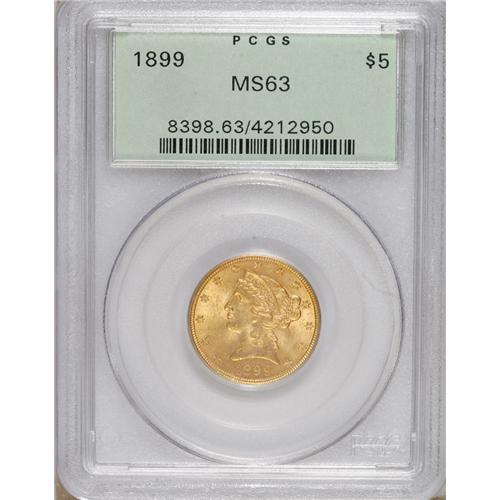 <B>1899 $5 MS63 PCGS.</B></I> The straw-gold surfaces reveal fine-grained textures and some splashes of amber-red on the reverse. Each side displays just a few minute marks. In a green label holder.<BR><BR><b>Shipping:</b> Coins & Currency (<a target="_blank" href="http://www.heritageauctions.com/common/shipping.php">view shipping information</a>)