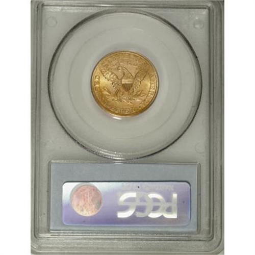 <B>1899 $5 MS63 PCGS.</B></I> A yellow-gold Liberty type coin that sports sweeping luster and an exacting strike. Faint obverse field grazes correspond with the designated grade.<BR><BR><B>Coin Engraver:</B> Christian Gobrecht<BR><BR><b>Shipping:</b> Coins & Currency (<a target="_blank" href="http://www.heritageauctions.com/common/shipping.php">view shipping information</a>)