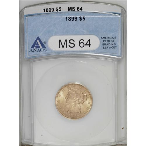 1899 $5 MS64 ANACS. Crisply struck and frosty. This pe