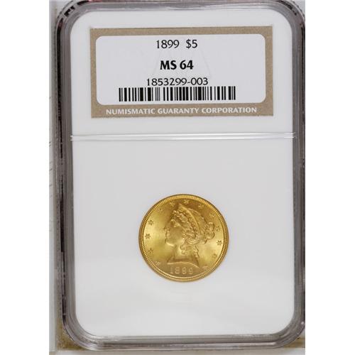 <B>1899 $5 MS64 NGC.</B></I> Flashy honey-gold luster enlivens both sides of this well struck near-Gem. There are no marks worthy of individual mention.<BR><BR><b>Shipping:</b> Coin/Currency (<a target="_blank" href="http://www.heritageauctions.com/common/shipping.php">view shipping information</a>)