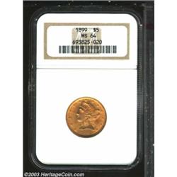<TABLE cellSpacing=0 cellPadding=0 width="100%" bgColor=#000000 border=0><TBODY><TR><TD width="100%"><TABLE cellSpacing=1 cellPadding=3 width="100%" border=0><TBODY><TR><TD width="100%" bgColor=#79735c><FONT face=arial color=#ffffff size=3><B>Description</B> </FONT></TD></TR><TR><TD width="100%" bgColor=#ffffff><FONT face=arial size=2><B>1899 $5 MS64 NGC.</B></I> Well struck with luscious deep amber-golden color, and two or three pinpoint-sized blemishes on the obverse. The reverse seems mark-free. Perhaps conservatively graded at MS64. </FONT></TD></TR></TBODY></TABLE></TD></TR></TBODY></TABLE><BR><A name=PricesRealized></A><TABLE cellSpacing=0 cellPadding=0 width="100%" bgColor=#000000 border=0><TBODY><TR><TD width="100%"><TABLE cellSpacing=1 cellPadding=3 width="100%" border=0><TBODY><TR><TD width="100%" bgColor=#79735c><A name=PR><FONT face=arial color=#ffffff size=3><B>Previous Prices from Heritage Auctions</B> </FONT></A></TD></TR><TR><TD bgColor=#f6f6ed><TABLE cellSpacing=0 cellPadding=0 width="100%" border=1><TBODY><TR><TD align=middle width="33%"><B>Date</B></TD><TD align=middle width="33%"><B>Service</B></TD><TD align=middle width="33%"><B>Price</B></TD></TR><TR bgColor=whitesmoke><TD width="33%"><B>10/06/2000</B></TD><TD width="33%">NGC</TD><TD width="33%">$615.25</TD></TR><TR bgColor=whitesmoke><TD width="33%"><B>11/07/1998</B></TD><TD width="33%">NGC</TD><TD width="33%">$1,485.00</TD></TR><TR bgColor=whitesmoke><TD width="33%"><B>03/01/2001</B></TD><TD width="33%">PCGS</TD><TD width="33%">$863.00</TD></TR><TR bgColor=whitesmoke><TD width="33%"><B>04/28/2002</B></TD><TD width="33%">PCGS</TD><TD width="33%">$747.50</TD></TR><TR bgColor=whitesmoke><TD width="33%"><B>01/06/2001</B></TD><TD width="33%">PCGS</TD><TD width="33%">$632.50</TD></TR><TR bgColor=whitesmoke><TD width="33%"><B>05/06/2000</B></TD><TD width="33%">PCGS</TD><TD width="33%">$782.00</TD></TR><TR bgColor=whitesmoke><TD width="33%"><B>06/27/2000</B></TD><TD width="33%">PCGS</TD><TD width="33%">$775.00</TD></TR><TR bgColor=whitesmoke><TD width="33%"><B>02/01/1991</B></TD><TD width="33%">PCGS</TD><TD width="33%">$2,640.00</TD></TR><TR bgColor=whitesmoke><TD width="33%"><B>11/01/1993</B></TD><TD width="33%">PCGS</TD><TD width="33%">$2,310.00</TD></TR><TR bgColor=whitesmoke><TD width="33%"><B>08/06/2003</B></TD><TD width="33%">NGC</TD><TD width="33%">$718.75</TD></TR><TR bgColor=whitesmoke><TD width="33%"><B>01/11/2003</B></TD><TD width="33%">NGC</TD><TD width="33%">$776.25</TD></TR><TR bgColor=whitesmoke><TD width="33%"><B>10/07/2001</B></TD><TD width="33%">NGC</TD><TD width="33%">$833.75</TD></TR><TR bgColor=whitesmoke><TD width="33%"><B>10/07/2001</B></TD><TD width="33%">NGC</TD><TD width="33%">$833.75</TD></TR><TR bgColor=whitesmoke><TD width="33%"><B>08/05/2001</B></TD><TD width="33%">NGC</TD><TD width="33%">$726.80</TD></TR><TR bgColor=whitesmoke><TD width="33%"><B>01/05/2001</B></TD><TD width="33%">NGC</TD><TD width="33%">$603.75</TD></TR><TR bgColor=whitesmoke><TD width="33%"><B>08/07/1998</B></TD><TD width="33%">NGC</TD><TD width="33%">$2,300.00</TD></TR><TR bgColor=whitesmoke><TD width="33%"><B>09/01/1994</B></TD><TD width="33%">NGC</TD><TD width="33%">$1,430.00</TD></TR></TBODY></TABLE></TD></TR><TR><TD bgColor=#ffffff><FONT face=arial size=1 ?>PLEASE NOTE: All prices realized reflect the final hammer price PLUS the buyer's premium in auctions that charge a buyer's premium. Each item has a notation at the top of the listing indicating whether that lot included a buyer's premium. Example: A item that sells with a final hammer price of $100 and a 20% buyer's premium will display with a price realized of $120. All information listed is intended to be as accurate as possible, but errors are possible. Please use this guide carefully and inform us of any inaccuracies. </FONT></TD></TR></TBODY></TABLE></TD></TR></TBODY></TABLE><BR><TABLE cellSpacing=0 cellPadding=0 width="100%" bgColor=#000000 border=0><TBODY><TR><TD width="100%"><TABLE cellSpacing=1 cellPadding=3 width="100%" border=0><TBODY><TR><TD width="100%" bgColor=#79735c colSpan=6><FONT face=arial color=#ffffff size=3><B>Price Guide*</B> </FONT></TD></TR><TR bgColor=#f6f6ed><TD align=middle><B>Grade</B> </TD><TD align=middle><B>Coin World<BR>(Trends)</B> </TD><TD align=middle><B>Numismedia<BR>Retail</B> </TD><TD align=middle><B>Numismedia<BR>Wholesale</B> </TD><TD align=middle><B>Coin<BR>Universe</B> </TD><TD align=middle><B>Heritage<BR>Value Index</B> </TD></TR><TR bgColor=#ffffff><TD align=middle>63</TD><TD align=right>$575.00</TD><TD align=right>$780.00</TD><TD align=right>$625.00</TD><TD align=right>$750.00</TD><TD align=right>$489.75</TD></TR><TR style="FONT-WEIGHT: bold" bgColor=#cccfdd><TD align=middle>64</TD><TD align=right>$1,200.00</TD><TD align=right>---</TD><TD align=right>$825.00</TD><TD align=right>$1,000.00</TD><TD align=right>$772.50</TD></TR><TR bgColor=#ffffff><TD align=middle>65</TD><TD align=right>---</TD><TD align=right>---</TD><TD align=right>$2,285.00</TD><TD align=right>$3,300.00</TD><TD align=right>$2,166.67</TD></TR><TR bgColor=#ffffff><TD colSpan=6><FONT size=1>*All information listed is intended to be as accurate as possible, but errors are possible. No item may be returned or refused based on this information which is provided as a service to our customers. You should contact each pricing source directly to determine the accuracy of this information. </FONT></TD></TR></TBODY></TABLE></TD></TR></TBODY></TABLE><BR><TABLE cellSpacing=0 cellPadding=0 width="100%" bgColor=#000000 border=0><TBODY><TR><TD width="100%"><TABLE cellSpacing=1 cellPadding=3 width="100%" border=0><TBODY><TR><TD width="100%" bgColor=#79735c><FONT face=arial color=#ffffff size=3><B>Population Guide</B> </FONT></TD></TR><TR bgColor=#ffffff><TD align=middle><!-- Begin Output of Population Grid--><TABLE cellSpacing=0 cellPadding=0 width="100%" border=0><TBODY><TR><TD vAlign=center><TABLE cellSpacing=0 width="100%" border=1 cellsadding="3"><TBODY><TR><TD vAlign=